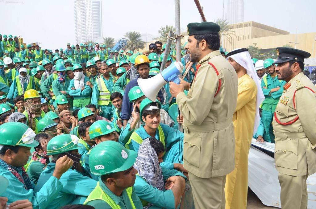 В ОАЭ непозволительно мигранту качать какие-то права и бастовать, обычно это очень жёстко пресекают и разгоняют, а зачинщиков – просто депортируют. Собственно вопрос там поставлен правильно: – Не нравятся законы и местные порядки? Уезжайте, или соблюдайте порядки и законыи, работайте на наших условиях!
